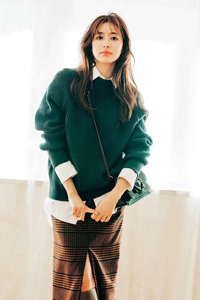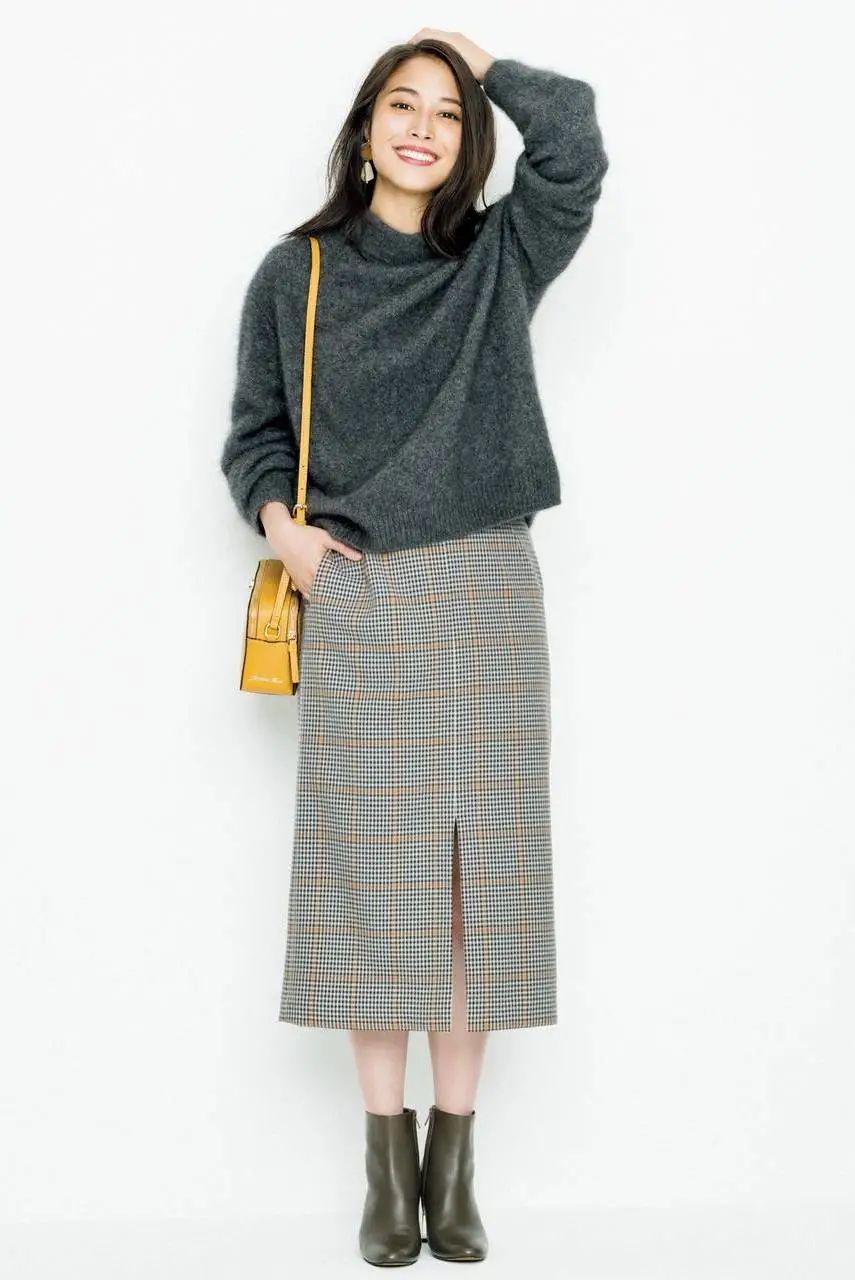 首先来看看这款大毛衣+格纹半裙的搭配。大毛衣给人一种温暖舒适的感觉,同时宽松的设计能够修饰身形,提升整体的比例感。