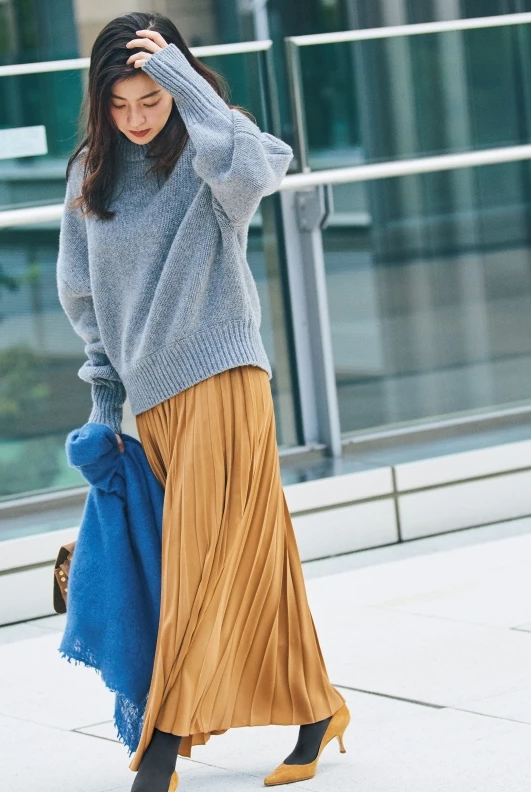 而灰色毛衣+黄色半裙,则把简约与不凡气质完美结合,穿出了知性与休闲的力量感,展现了女性内在的独立与自信。