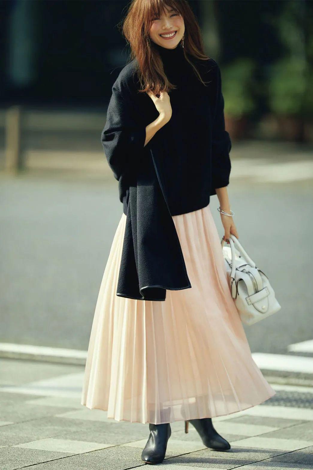 比如,黑色毛衣+粉色半裙,通过黑与粉的对比,巧妙地展现了大女人的气场。这一搭配不仅带有沉稳大气的氛围,还在粉色的点缀下散发着女性的柔美与活力。